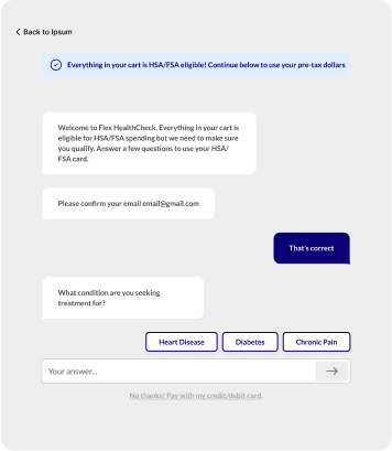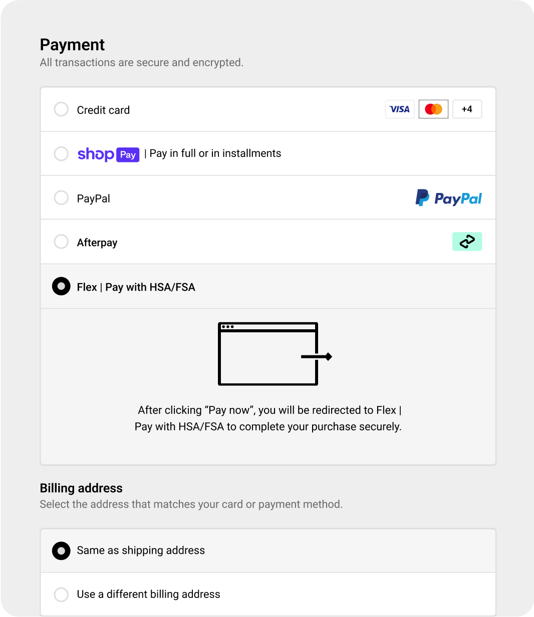 To use your HSA or FSA debit card, add products to your cart as you normally would. At checkout, select “Pay with HSA/FSA” as your payment option, enter your HSA or FSA debit card, and complete your checkout as usual. If your cart contains both eligible and ineligible items, you will be prompted to enter your HSA or FSA debit card information, along with your credit or debit card, on the same screen.
